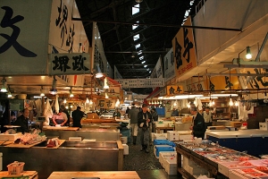 水産物の取扱規模が世界最大級の総合市場。関東大震災で日本橋魚市場がダメになり、それに代わってこの地に市場が建設された。中央卸売市場(場内市場)と場外市場があり、場外市場は一般客でも買い物が楽しめる。市場では鮮魚、乾物などが買えるほか、飲食店があり新鮮なものを食べることができる。午後になると閉める店も多いので注意。