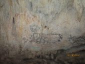 洞窟の中は1年中一定の気温が保たれていて少し涼しく感じます。 洞窟の中は暗く、ガイドさんの案内で見学をします。入ってすぐの壁の前でガイドさんが写真を撮ってくれます。 暗くて何も見えないのですが撮ってもらった写真を見ると洞窟の壁に描かれた壁画が写っています。 説明によると古代の先住民による壁画だそうです。