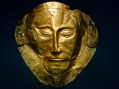 ミケーネ遺跡で1876年にシュリーマンにより発見された、葬儀用の黄金の仮面。シュリーマンはこれをアガメムノンのマスクだと主張しましたが、調査の結果、このマスクはアガメムノンの活動時期よりも早い時代のものだと判明しています。