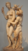 愛と美の女神、アフロディテ。優雅な姿で描かれることが多い彼女ですが、ここでは言い寄ってくる牧神パンをサンダルでたたいて追い払おうという何ともコミカルな場面が描かれています。母親の背後から顔をのぞかせてパンの角に触っているのがエロス。ミロス島で発見されました。