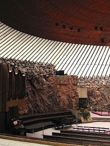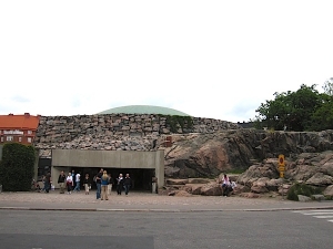 1969年にスオマライネン兄弟の設計により、大岩を掘り下げて作られた世界でも大変珍しいフィンランド福音ルター派の教会。この教会は円形状で、屋根には大きな青銅のドームを乗せ、壁は掘り出したままの岩をむき出しにしています。壁上部にはガラス窓がたっぷりとはめ込まれており、自然光が美しく差し込み、幻想的で神聖な世界を演出しています。また、岩壁は音響効果に大変優れており、コンサート場としても頻繁に使用されます。