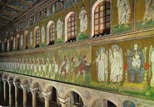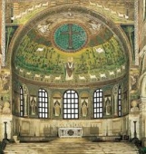 ラヴェンナ駅からバスで約15分南下した小さな街クラッセにたたずむ聖堂。8月には聖堂へ向かう一本道の左側一体がひまわりで覆われ夏の青空とハーモニーを奏でる美しい光景になる。この町はかつて古代ローマ帝国時代に、初代皇帝アウグストゥスの船隊の駐屯させた港町だった。実際聖堂前の小路左手に置かれた彼のすばらしい銅像が観光客を迎え歴史を語っている。堂内は3廊からなっており前方中央の豪華なモザイクはキリストと12の羊と化した使徒を中心に描いたもの。その煌びやかなモザイクの美しさを鑑賞しに世界中のツーリストが訪れる。聖堂の脇には小奇麗なホテルを併設したレストラン・バールがあり午後の休憩に便利だ。