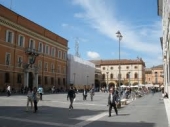 ドゥオモ広場北側を走るグエッリーニ通りを右に折れ、カドゥーティ広場へ向かい、左手のリッチ通りすぐ、美しい広場に面した、ダンテゆかりのサン・フランチェスコ聖堂が現れる。堂内にある地下浸水の小さな聖堂は金魚も泳ぐ池になっている。隣接した白い小さなダンテの墓は聖堂向かって左手にある。この後の観光は中心地から出るので、この辺でお昼休みをとろう。