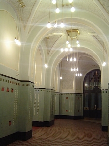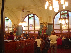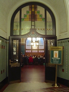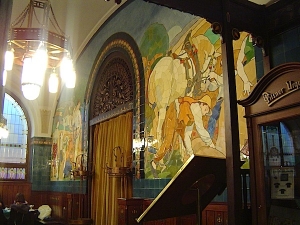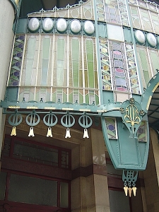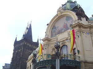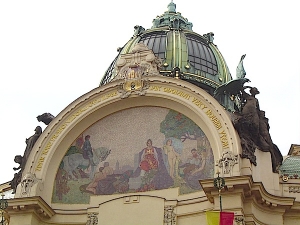 アールヌーヴォー建築が数多く点在するプラハの中でも一際目立って美しく立つのは1911年に建てらた市民会館です。この市民会館はアルフォン・ミュシャを筆頭にしたアールーヌーヴォー芸術家たちが耽美的な装飾を施しており、特に正面玄関のカレル・シュピラー作のモザイク画「プラハの感謝」は有名です。入り口下部の素晴らしいステンドグラスを始め、会館内のあちこちにアールヌーヴォー特有の美しい曲線ライン装飾が見られ豪華絢爛です。内部にはコンサート「プラハの春」が開催されるスメタナ・ホールや、吉舎店、スラブ室(ミュシャの壁画がある部屋)、東洋室、市長ホールなどがあり、毎日催行さているガイドツアーでそれらを見物することが可能です。