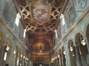 こちらはコロッセオのそばにある教会です。内部は素晴らしいモザイク装飾。残念ながら写真撮影は不可ですが、この教会はそれだけではありません!実は合計3層もの層から成る教会なのです。1Fは12世紀のモザイク装飾が美しい教会、地下に降りるとなんと4世紀頃の教会跡、さらに地下に降りると1世紀頃の住居跡と2~3世紀頃のミトラ教の神殿が現れます!なにやらマトリョーシカのようですが、暗い地下にある神殿は美しく、きっと良い思い出になるでしょう。地下では水の音、大下水溝Cloaca Maximaの流れる音も聞くことができますよ。ちなみに暗くて人が少ないので一人はちょっと怖いかもしれません。コロッセオ観光のついでに立ち寄るのもおすすめです☆