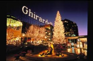 1849年、イタリアから来たドミンゴ・ギラデリが製造を始め、今やサンフランシスコ名物ともなっているギラデリチョコレート。現在はこの工場が改装され、ショッピングセンターになっている。海を見下ろすロケーションにあり、「Ghirardelli」と大きなサイン塔がある赤レンガの建物だ。建物は7つあり、マスタードビル、ココアビル、チョコレートビルなどの名前が付けられている。クロックタワー・ビルには、ギラデリチョコ専門のカフェ、Ghirardelli Chocolate Manufactoryやショップがある。敷地内にフェアモントホテルも併設されている。