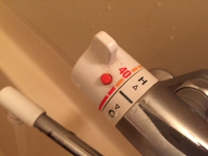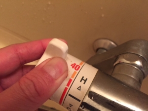 浴室内シャワー温度調整。上にまわせば暖かいお湯。